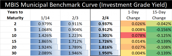 Municipal Bond Trends for February 4, 2020 info2020-04-16T08:06:42-05:00February 5th, 2020| The interest rate table above illustrates recent changes in a sample of MBIS “investment grade” yields. Every issuer’s credit is different. For rates that may be applicable to your municipality, contact our Municipal Advisors.