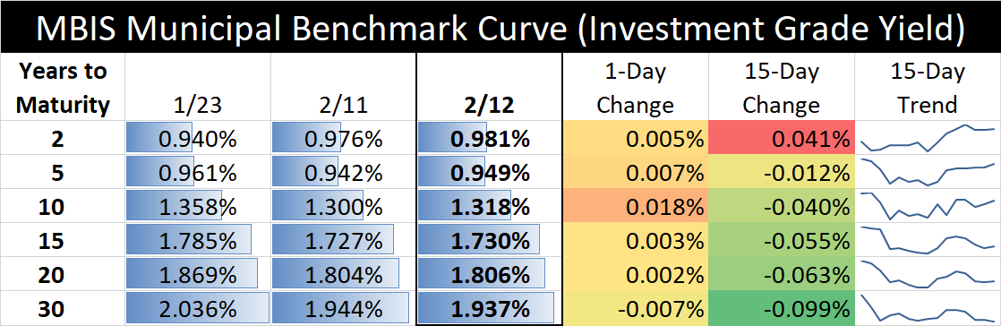 The interest rate table above illustrates recent changes in a sample of MBIS “investment grade” yields. Every issuer’s credit is different. For rates that may be applicable to your municipality, contact our Municipal Advisors.