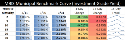 The interest rate table above illustrates recent changes in a sample of MBIS “investment grade” yields. Every issuer’s credit is different. For rates that may be applicable to your municipality, contact our Municipal Bond Advisors, Larry Kleeman and Beth Warren.