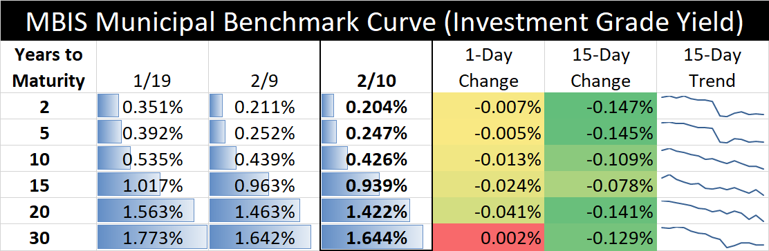 The interest rate table above illustrates recent changes in a sample of MBIS “investment grade” yields. Every issuer’s credit is different. For rates that may be applicable to your municipality, contact our Municipal Bond Advisors, Larry Kleeman and Beth Warren.