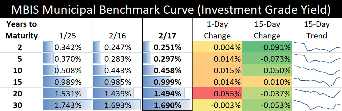 The interest rate table above illustrates recent changes in a sample of MBIS “investment grade” yields. Every issuer’s credit is different. For rates that may be applicable to your municipality, contact our Municipal Bond Advisors, Larry Kleeman and Beth Warren.