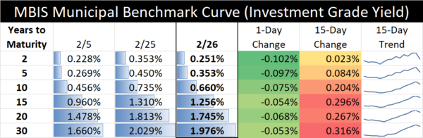 The interest rate table above illustrates recent changes in a sample of MBIS “investment grade” yields. Every issuer’s credit is different. For rates that may be applicable to your municipality, contact our Municipal Bond Advisors, Larry Kleeman and Beth Warren.