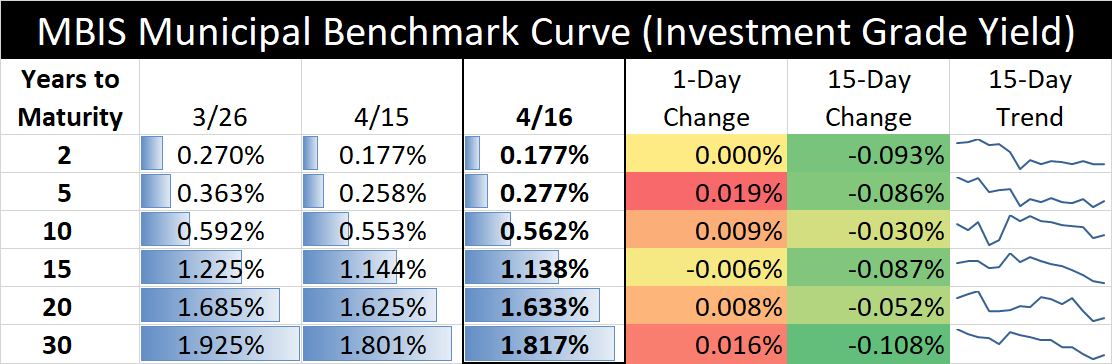 The interest rate table above illustrates recent changes in a sample of MBIS “investment grade” yields. Every issuer’s credit is different. For rates that may be applicable to your municipality, contact our Municipal Bond Advisors, Larry Kleeman and Beth Warren.