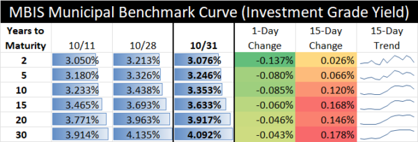 The interest rate table above illustrates recent changes in a sample of MBIS “investment grade” yields. Every issuer’s credit is different. For rates that may be applicable to your municipality, contact our Municipal Bond Advisors, Larry Kleeman and Beth Warren.