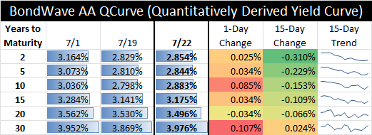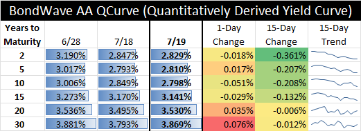 The interest rate table above illustrates recent changes in a sample of AA rated bond trades reported to the Municipal Securities Rulemaking Board’s EMMA® system. Every issuer’s credit is different, and other financing sources may be available. To obtain comprehensive Financial Advisory services for your local government, contact your Ranson Financial Municipal Advisor, Larry Kleeman, or Henry Schmidt.