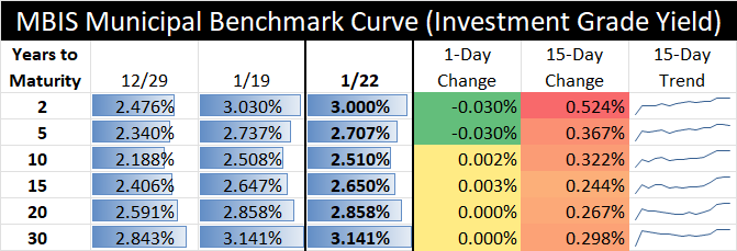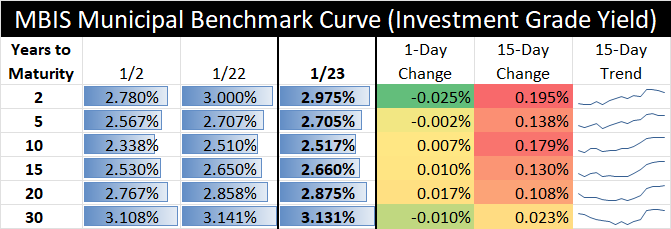 The interest rate table above illustrates recent changes in a sample of MBIS “investment grade” yields. Every issuer’s credit is different, and other financing sources may be available. To obtain comprehensive Financial Advisory services for your local government, contact your Ranson Financial Municipal Advisor, Larry Kleeman, or Henry Schmidt.