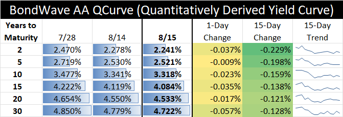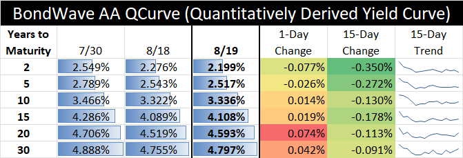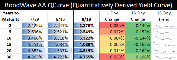The interest rate table above illustrates recent changes in a sample of AA rated bond trades reported to the Municipal Securities Rulemaking Board’s EMMA® system. Every issuer’s credit is different, and other financing sources may be available. To obtain comprehensive Financial Advisory services for your local government, contact your Ranson Financial Municipal Advisor, Larry Kleeman, or Henry Schmidt.