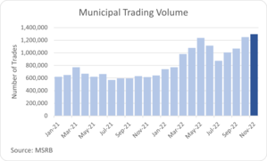 The Municipal Securities Rulemaking Board (MSRB) reported that trading volume reached another record in November 2022, with 1.29 million municipal bond trades recorded. November trades exceeded October’s previous record of 1.25 million trades and was more than double the volume in November 2021. Year to date, municipal bond trade count is up 63% compared to the same period in 2021, likely fueled by individual investor demand, as customer purchases and inter-dealer trades rose more than customer sales. As anticipated in a recent press release, November 2022 was the seventh month in the last eight months with more than 1 million trades being reported to the MSRB. This compares to only eight months in the last 15 years with more than 1 million trades. Meanwhile, increased demand coupled with decreased supply caused tax-exempt benchmark yields to decline by 55-65 basis points during the month.