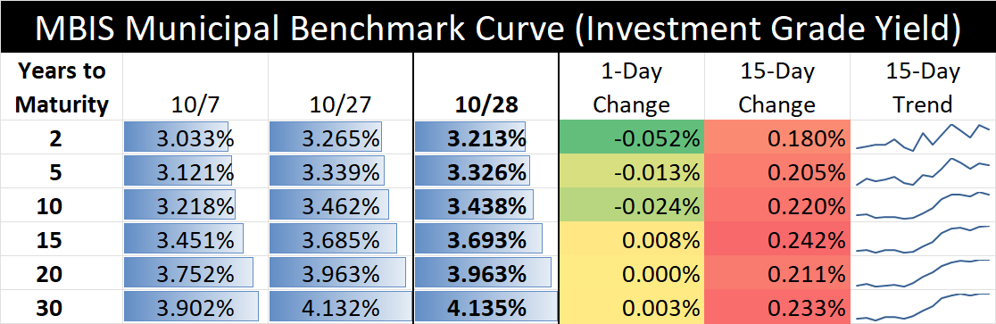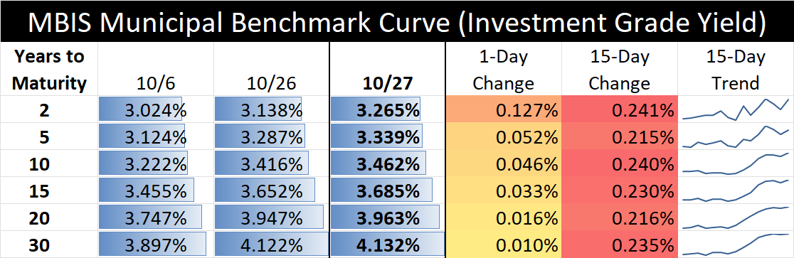 The interest rate table above illustrates recent changes in a sample of MBIS “investment grade” yields. Every issuer’s credit is different. For rates that may be applicable to your municipality, contact our Municipal Bond Advisors, Larry Kleeman and Beth Warren.