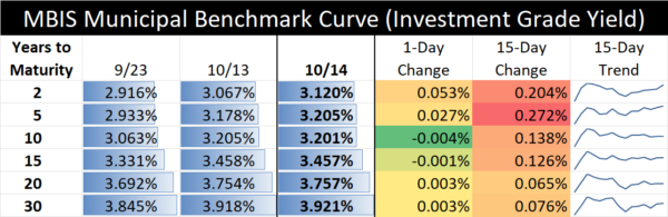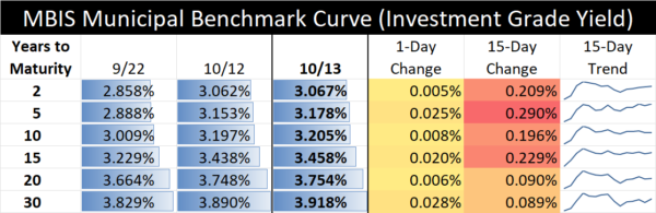 The interest rate table above illustrates recent changes in a sample of MBIS “investment grade” yields. Every issuer’s credit is different. For rates that may be applicable to your municipality, contact our Municipal Bond Advisors, Larry Kleeman and Beth Warren.