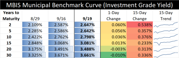 The interest rate table above illustrates recent changes in a sample of MBIS “investment grade” yields. Every issuer’s credit is different. For rates that may be applicable to your municipality, contact our Municipal Bond Advisors, Larry Kleeman and Beth Warren.