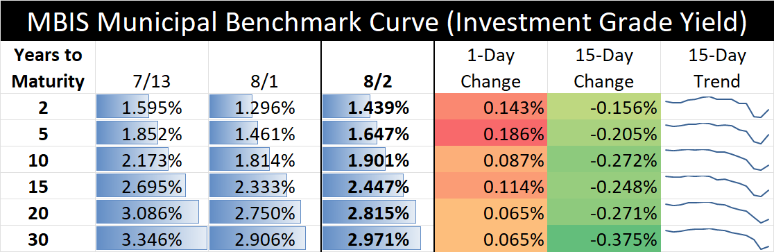 The interest rate table above illustrates recent changes in a sample of MBIS “investment grade” yields. Every issuer’s credit is different. For rates that may be applicable to your municipality, contact our Municipal Bond Advisors, Larry Kleeman and Beth Warren.
