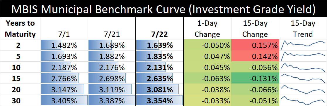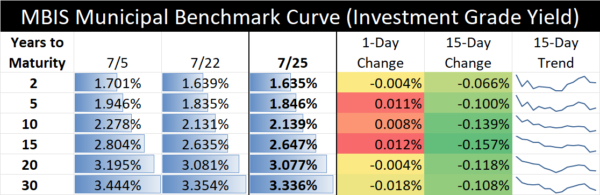 The interest rate table above illustrates recent changes in a sample of MBIS “investment grade” yields. Every issuer’s credit is different. For rates that may be applicable to your municipality, contact our Municipal Bond Advisors, Larry Kleeman and Beth Warren.