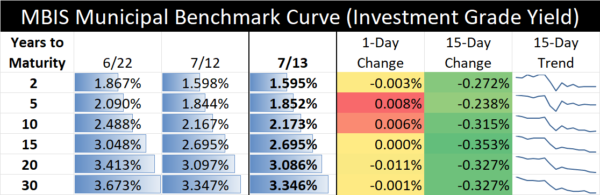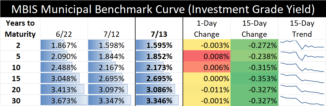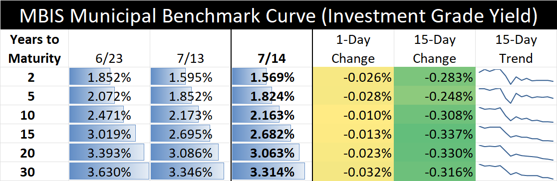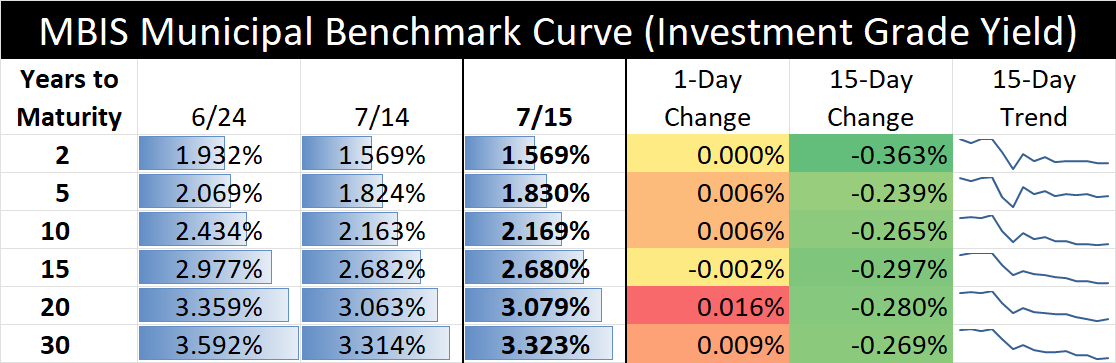 The interest rate table above illustrates recent changes in a sample of MBIS “investment grade” yields. Every issuer’s credit is different. For rates that may be applicable to your municipality, contact our Municipal Bond Advisors, Larry Kleeman and Beth Warren.
