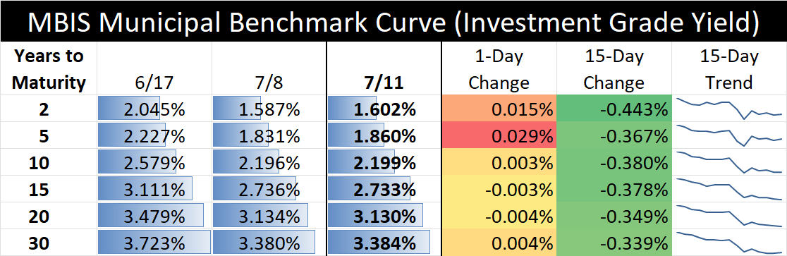 The interest rate table above illustrates recent changes in a sample of MBIS “investment grade” yields. Every issuer’s credit is different. For rates that may be applicable to your municipality, contact our Municipal Bond Advisors, Larry Kleeman and Beth Warren.