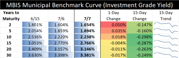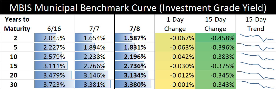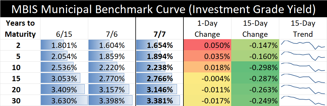 The interest rate table above illustrates recent changes in a sample of MBIS “investment grade” yields. Every issuer’s credit is different. For rates that may be applicable to your municipality, contact our Municipal Bond Advisors, Larry Kleeman and Beth Warren.