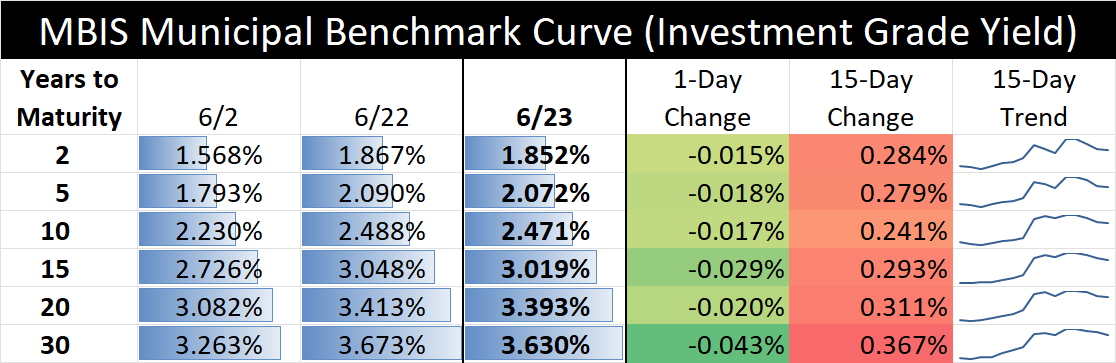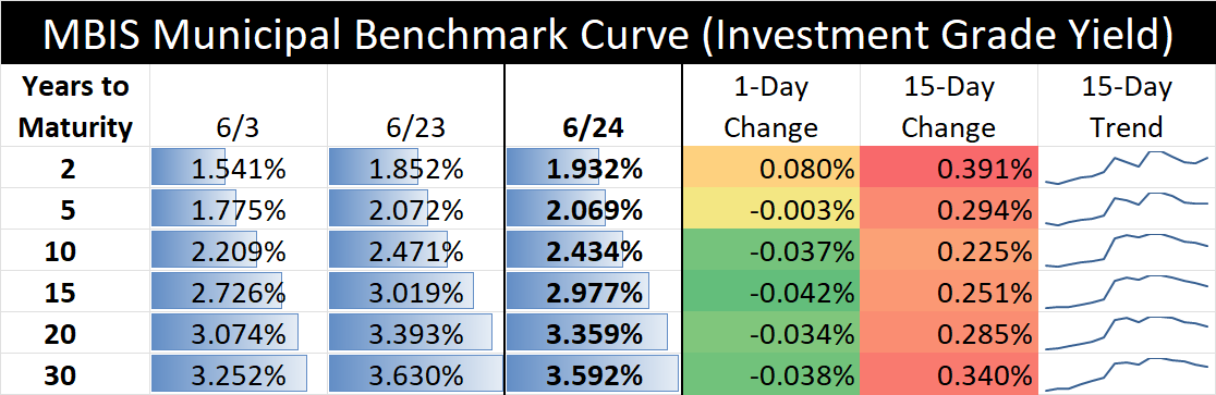 The interest rate table above illustrates recent changes in a sample of MBIS “investment grade” yields. Every issuer’s credit is different. For rates that may be applicable to your municipality, contact our Municipal Bond Advisors, Larry Kleeman and Beth Warren.