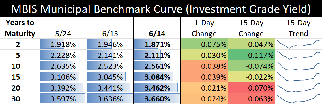 The interest rate table above illustrates recent changes in a sample of MBIS “investment grade” yields. Every issuer’s credit is different. For rates that may be applicable to your municipality, contact our Municipal Bond Advisors, Larry Kleeman and Beth Warren.