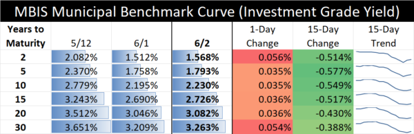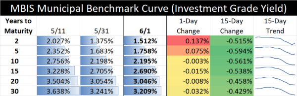 The interest rate table above illustrates recent changes in a sample of MBIS “investment grade” yields. Every issuer’s credit is different. For rates that may be applicable to your municipality, contact our Municipal Bond Advisors, Larry Kleeman and Beth Warren.