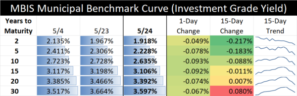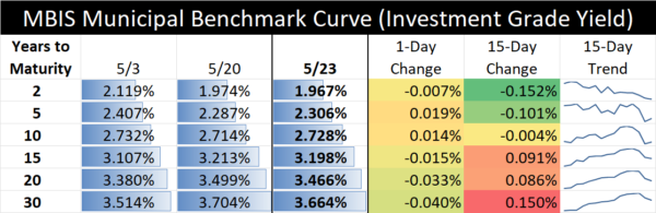 The interest rate table above illustrates recent changes in a sample of MBIS “investment grade” yields. Every issuer’s credit is different. For rates that may be applicable to your municipality, contact our Municipal Bond Advisors, Larry Kleeman and Beth Warren.