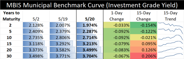 The interest rate table above illustrates recent changes in a sample of MBIS “investment grade” yields. Every issuer’s credit is different. For rates that may be applicable to your municipality, contact our Municipal Bond Advisors, Larry Kleeman and Beth Warren.
