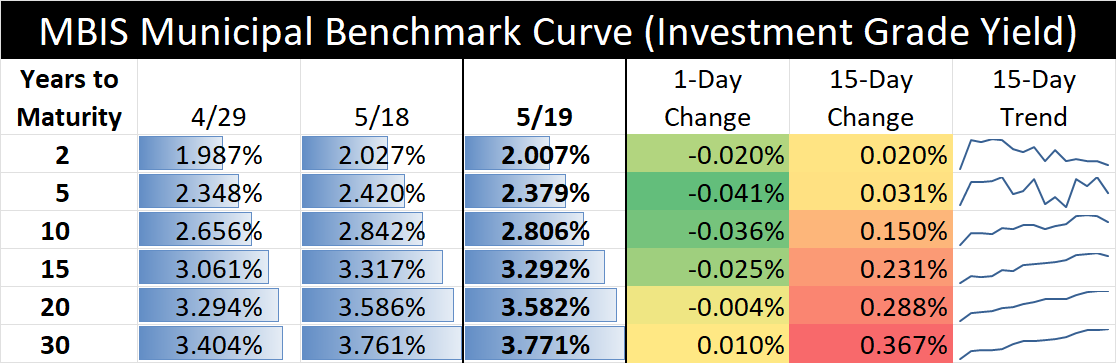 The interest rate table above illustrates recent changes in a sample of MBIS “investment grade” yields. Every issuer’s credit is different. For rates that may be applicable to your municipality, contact our Municipal Bond Advisors, Larry Kleeman and Beth Warren.
