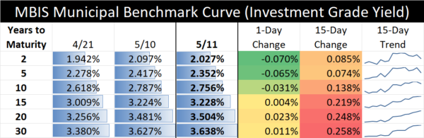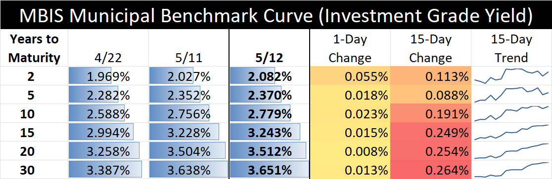 The interest rate table above illustrates recent changes in a sample of MBIS “investment grade” yields. Every issuer’s credit is different. For rates that may be applicable to your municipality, contact our Municipal Bond Advisors, Larry Kleeman and Beth Warren.