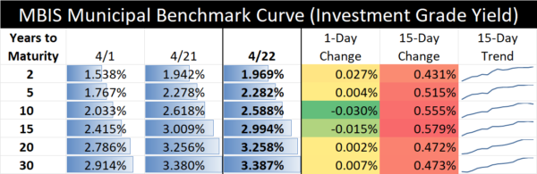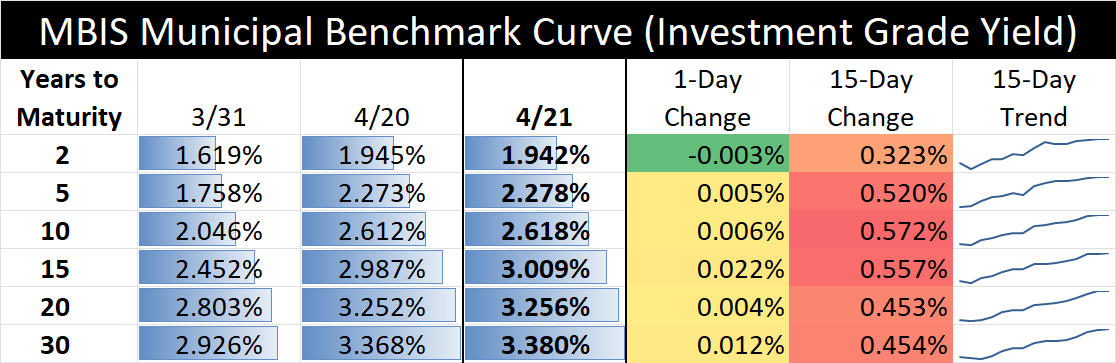 The interest rate table above illustrates recent changes in a sample of MBIS “investment grade” yields. Every issuer’s credit is different. For rates that may be applicable to your municipality, contact our Municipal Bond Advisors, Larry Kleeman and Beth Warren.