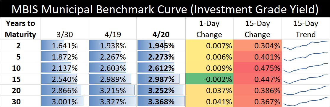 The interest rate table above illustrates recent changes in a sample of MBIS “investment grade” yields. Every issuer’s credit is different. For rates that may be applicable to your municipality, contact our Municipal Bond Advisors, Larry Kleeman and Beth Warren.