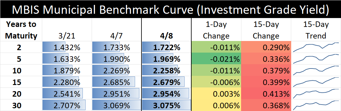 The interest rate table above illustrates recent changes in a sample of MBIS “investment grade” yields. Every issuer’s credit is different. For rates that may be applicable to your municipality, contact our Municipal Bond Advisors, Larry Kleeman and Beth Warren.