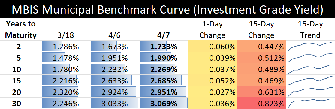 The interest rate table above illustrates recent changes in a sample of MBIS “investment grade” yields. Every issuer’s credit is different. For rates that may be applicable to your municipality, contact our Municipal Bond Advisors, Larry Kleeman and Beth Warren.