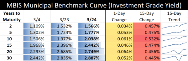 The interest rate table above illustrates recent changes in a sample of MBIS “investment grade” yields. Every issuer’s credit is different. For rates that may be applicable to your municipality, contact our Municipal Bond Advisors, Larry Kleeman and Beth Warren.