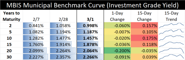 The interest rate table above illustrates recent changes in a sample of MBIS “investment grade” yields. Every issuer’s credit is different. For rates that may be applicable to your municipality, contact our Municipal Bond Advisors, Larry Kleeman and Beth Warren.