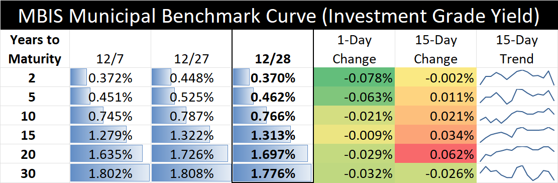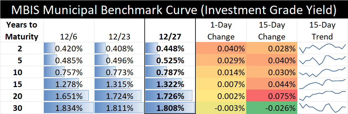The interest rate table above illustrates recent changes in a sample of MBIS “investment grade” yields. Every issuer’s credit is different. For rates that may be applicable to your municipality, contact our Municipal Bond Advisors, Larry Kleeman and Beth Warren.