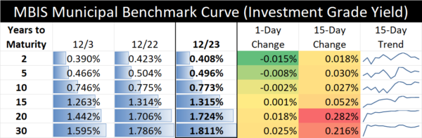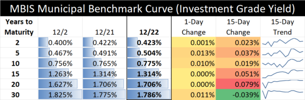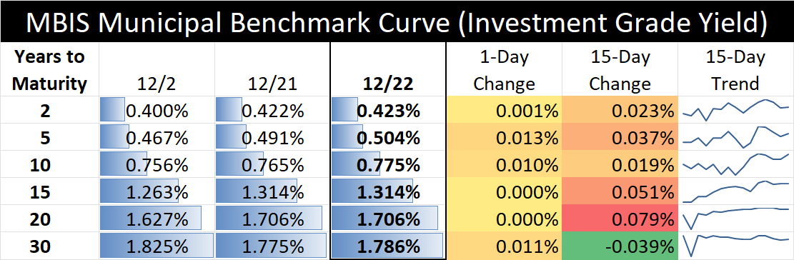 The interest rate table above illustrates recent changes in a sample of MBIS “investment grade” yields. Every issuer’s credit is different. For rates that may be applicable to your municipality, contact our Municipal Bond Advisors, Larry Kleeman and Beth Warren.