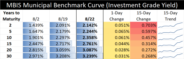 The interest rate table above illustrates recent changes in a sample of MBIS “investment grade” yields. Every issuer’s credit is different. For rates that may be applicable to your municipality, contact our Municipal Bond Advisors, Larry Kleeman and Beth Warren.